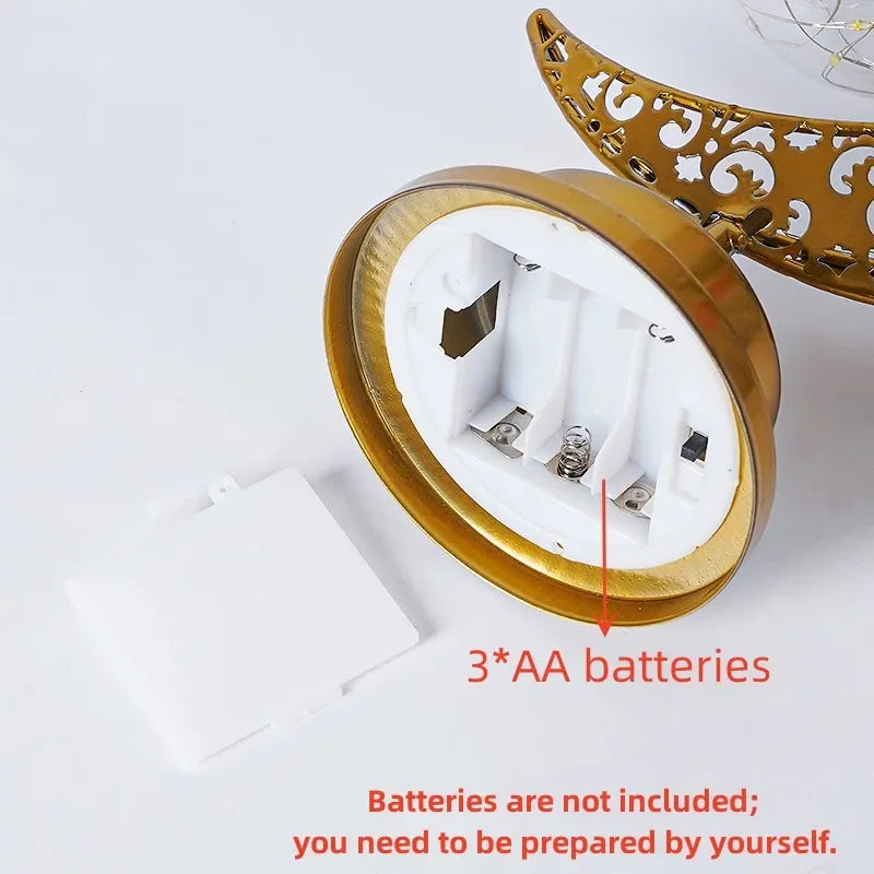 Durable metal frame with intricate Islamic patterns and built-in warm LED lights, powered by USB or batteries.