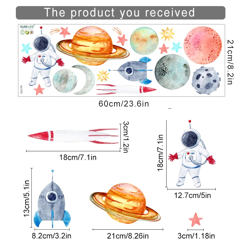 Short Description: Create an inspiring cosmic nursery with these charming universe planet space astronaut wall stickers featuring 3D effects — perfect removable decoration that transforms boys' rooms into stellar exploration headquarters!